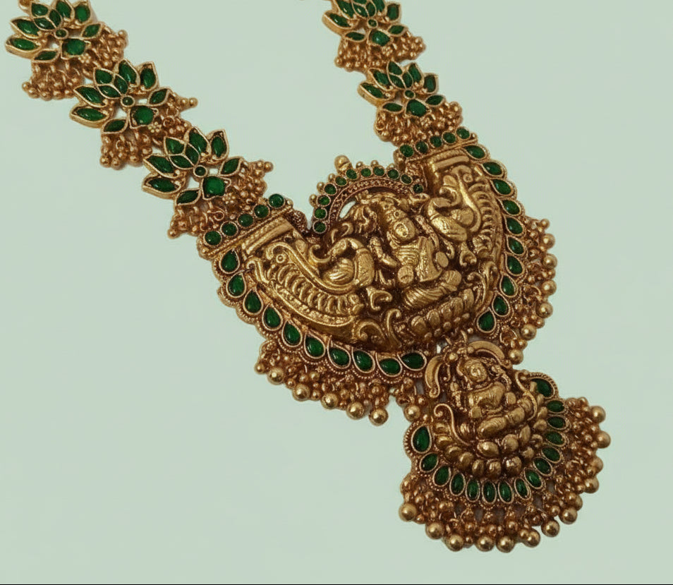 Celebrate timeless tradition with this temple jewelry set, featuring a majestic necklace and matching earrings. Designed with intricate artistry, this piece embodies the grandeur of South Indian heritage while adding a touch of regal elegance to any festive or bridal look.