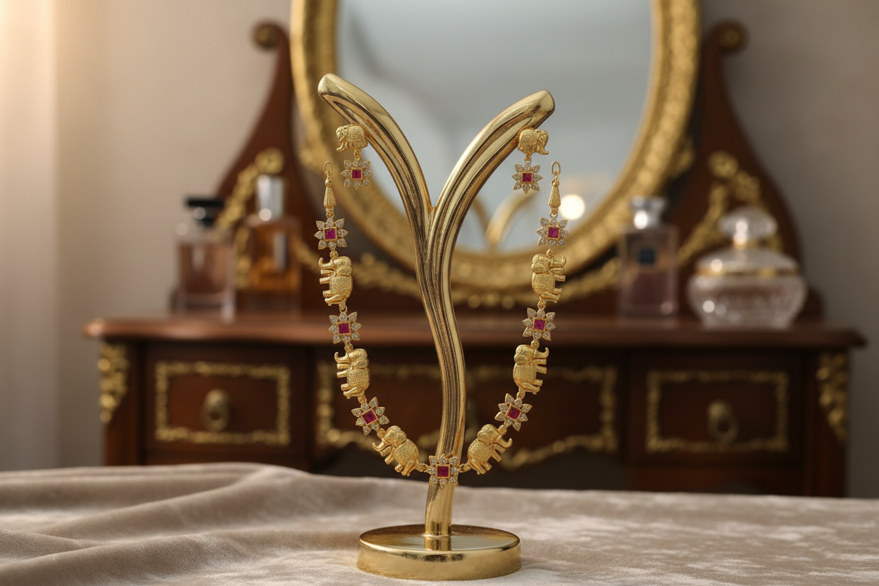 A traditional gold-toned necklace-and-earring set featuring alternate elephant motifs and floral designs with magenta stones, symbolizing strength, prosperity, and timeless heritage.