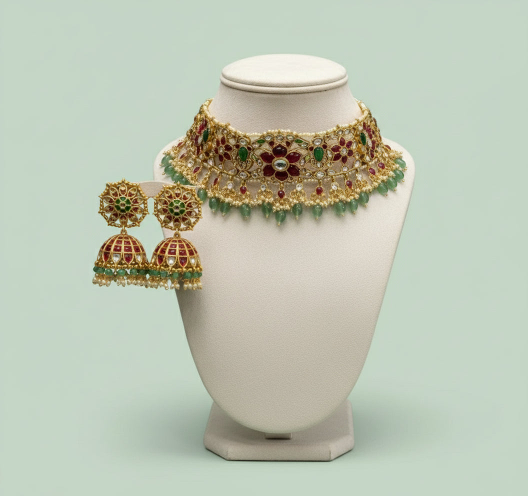 Regal red-green choker set with jhumka earrings, handcrafted in gold-tone metal and adorned with temple-style floral motifs and pearl accents.