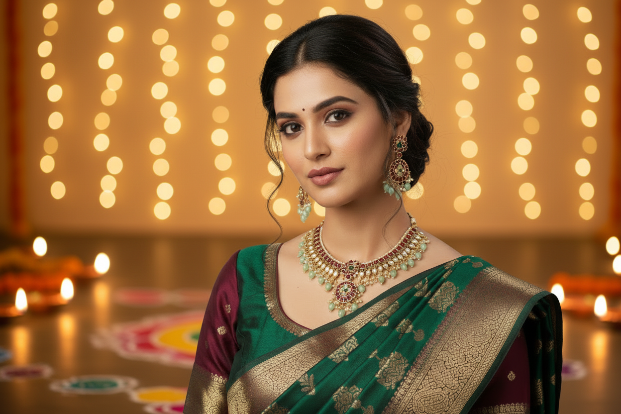 - Pair it with a Kanjivaram or Banarasi saree for weddings and temple ceremonies, or let it elevate a lehenga for festive occasions.