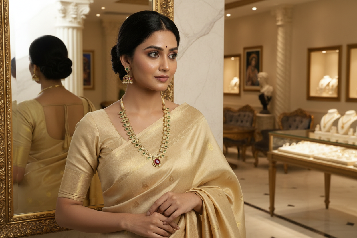 - Pair rich silk sarees in emerald green, ruby red, or ivory gold to echo its temple-inspired palette